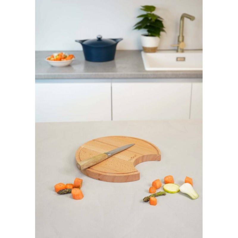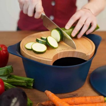 Tagliere sagomato salvaspazio in legno per poter lavorare direttamente sulla Incredibile Cocotte di Cookut di 24 cm.